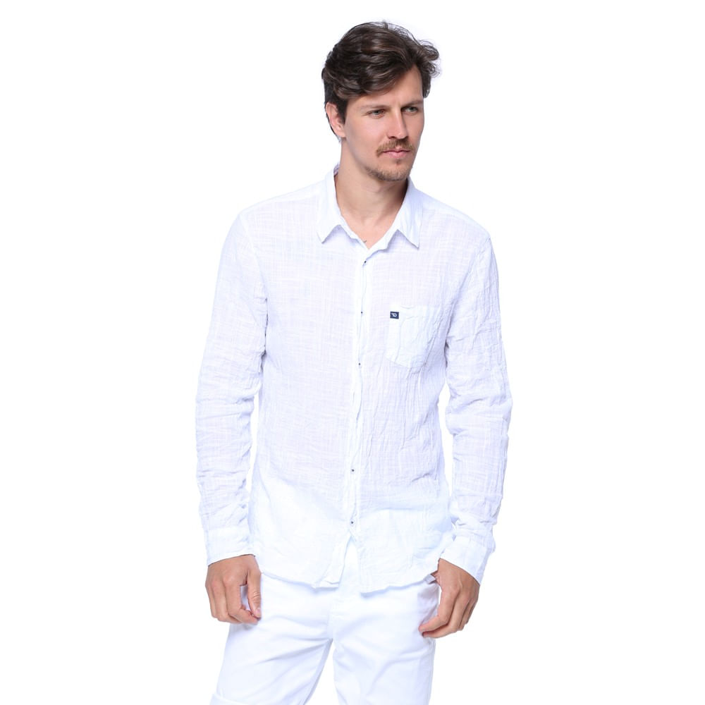 Camisa masculina desenvolvida em tecido plano com linho em sua composição, material nobre de aspecto natural.